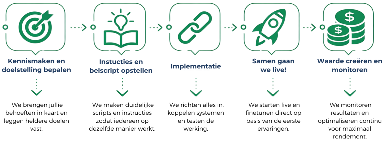 Stel eenvoudig een pakket samen dat volledig aansluit op de wensen van de organisatie. Er wordt actief meegedacht om tot een passende oplossing te komen. Alleen de diensten die echt nodig zijn worden opgenomen. Dat zorgt voor meer rust, tevreden klanten en ruimte om te groeien. Plan vrijblijvend een gesprek en ontdek de mogelijkheden.